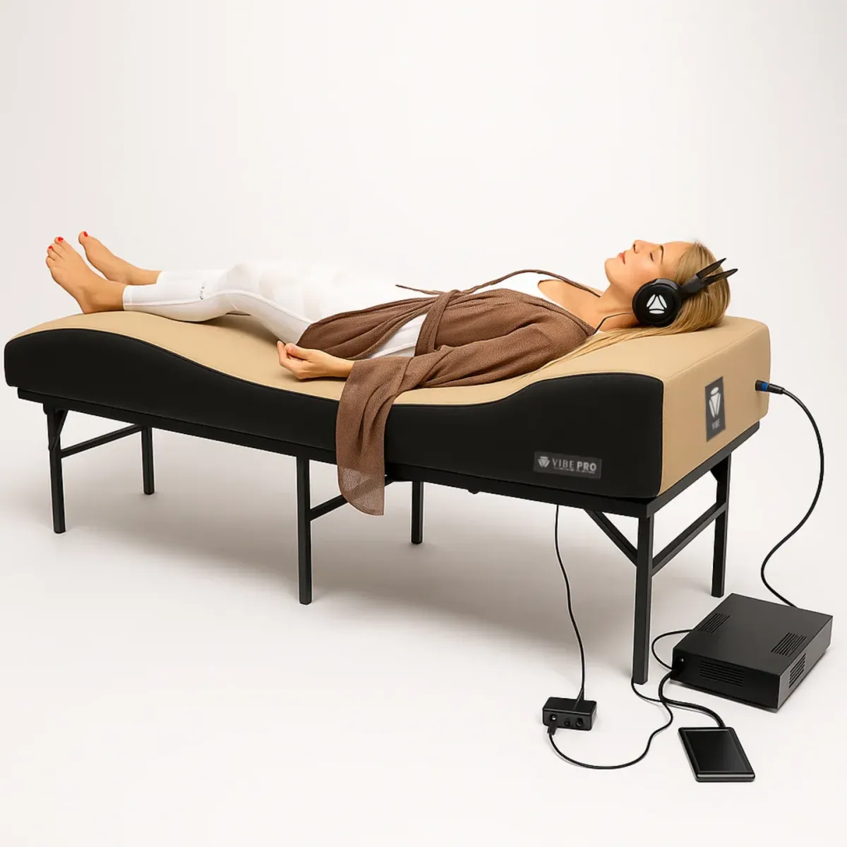 The V.I.B.E. System (Vibrational Individual Body Enhancement) combines precisely calibrated sounds and vibrations to create a full-body therapeutic experience. As you lie on the bed, it transmits Specialized music programs called Sonic-ceuticals™️ frequencies through your entire body, helping to balance your system and promote wellness.